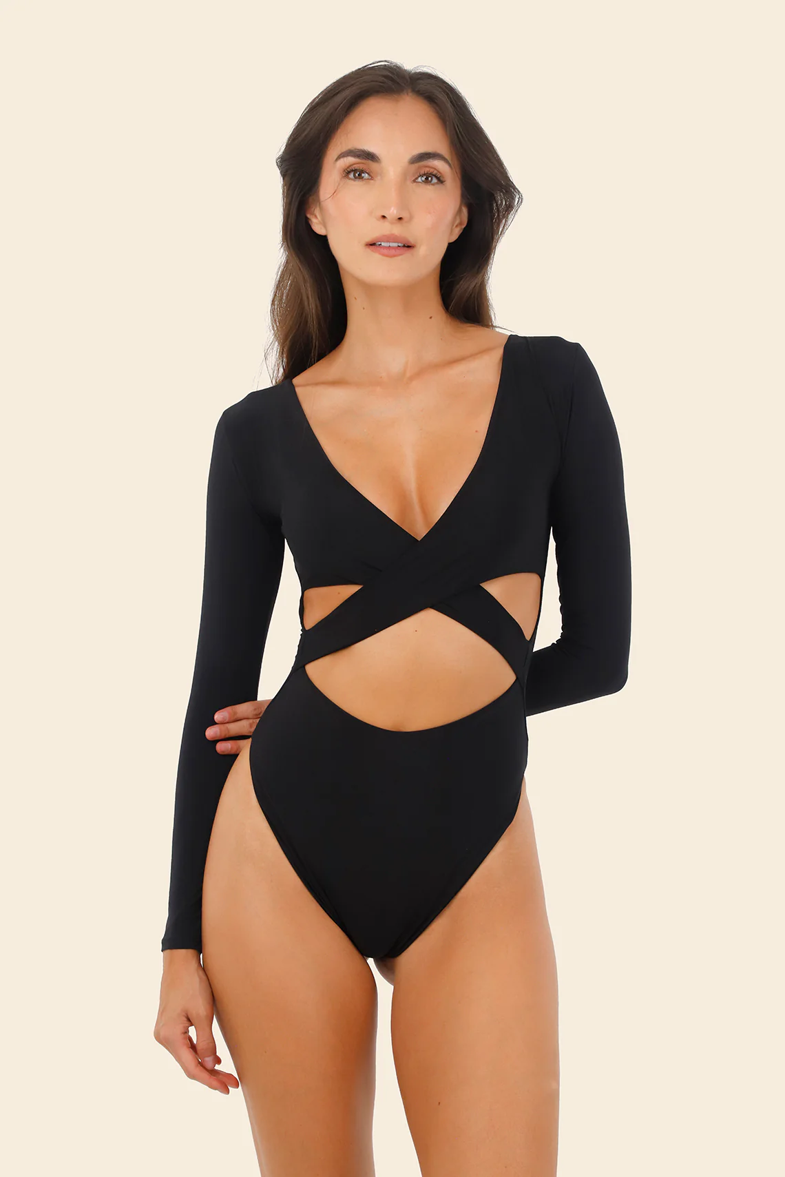 Una pieza con intrincados detalles de correas tejidas en la espalda. Cobertura media en la parte inferior, y espalda descubierta.